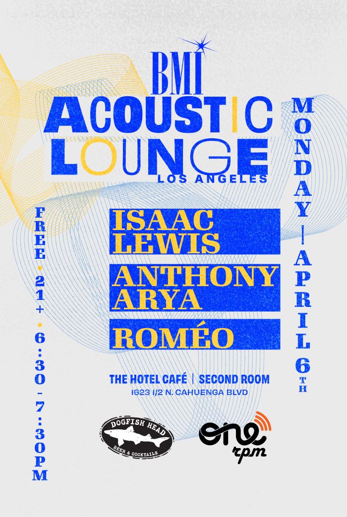 BMI Acoustic Lounge at The Hotel Café, Second Room (1623 1/2 N. Cahuenga Blvd., Los Angeles), 6:30-7:30 PM. Admission is FREE!; 21+ Only.