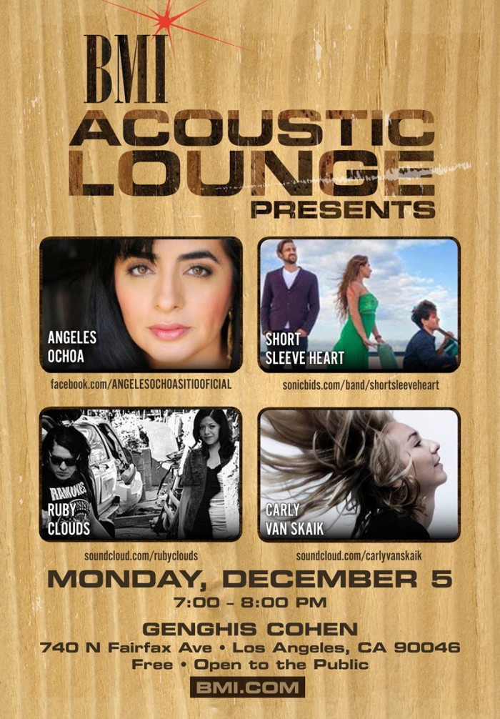 BMI Acoustic Lounge is held the first Monday of every month at Genghis Cohen (740 N. Fairfax Avenue, Los Angeles), 7:00-8:00 PM.