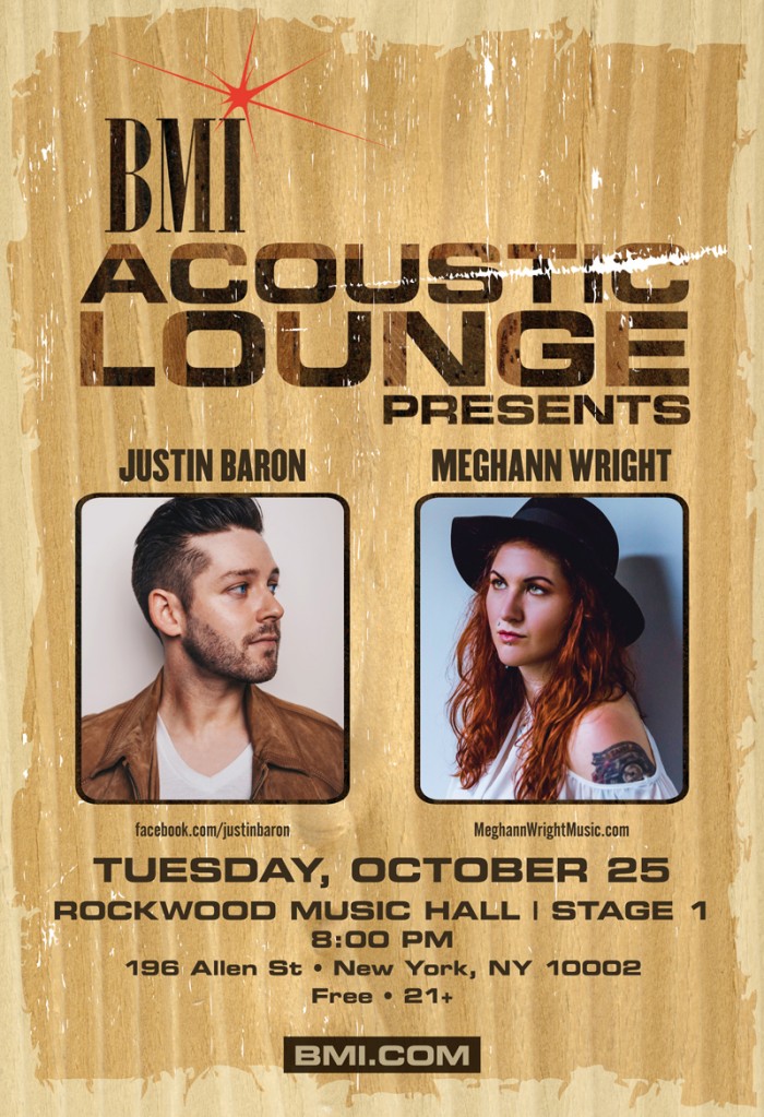 Singer/songwriter showcase series featuring acoustic performances in an intimate setting as well as networking opportunities with other songwriters and BMI representatives at Rockwood Music Hall, Stage 1 (196 Allen Street, NYC) at 8:00 PM.