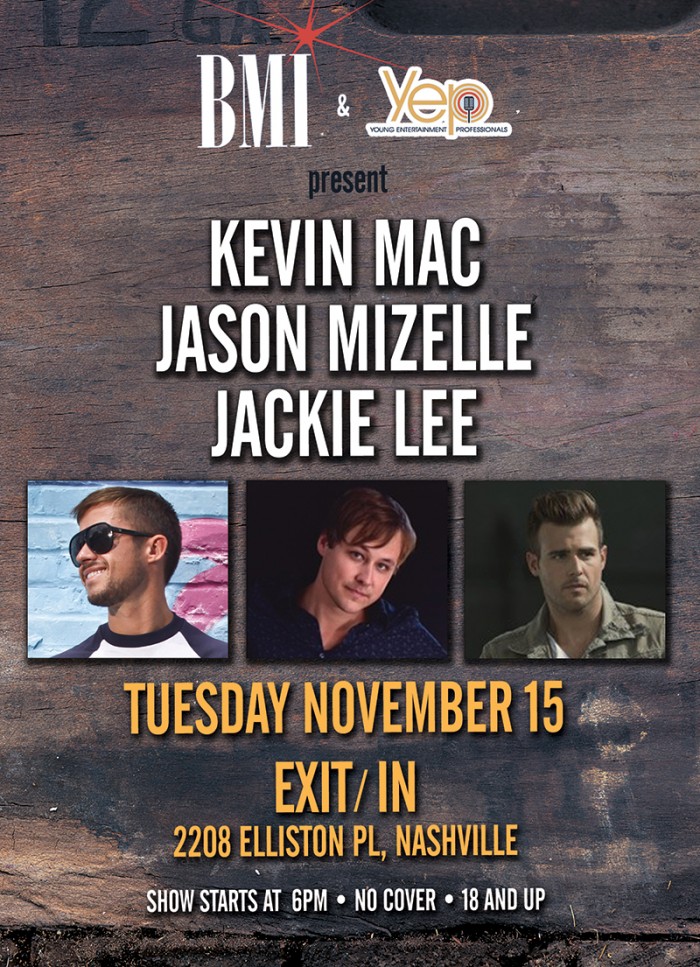 BMI & Young Entertainment Professionals (Yep) present a showcase featuring Kevin Mac, Jason Mizelle and Jackie Lee at Exit/In (2208 Elliston Place, Nashville, TN) at 6:00 PM.