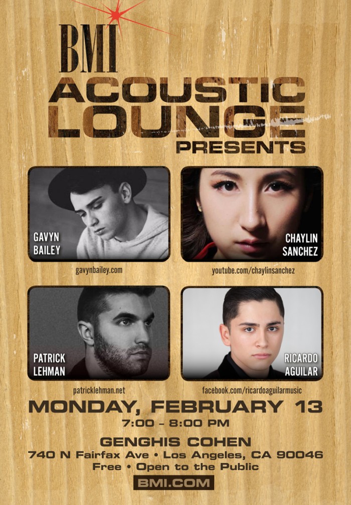 BMI Acoustic Lounge is generally held the first Monday of every month at Genghis Cohen (740 N. Fairfax Avenue, Los Angeles), 7:00-8:00 PM.
