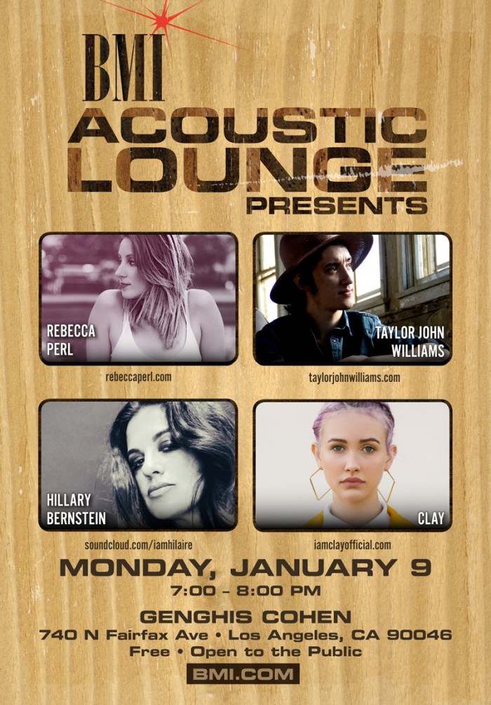 BMI Acoustic Lounge is held the first Monday of every month at Genghis Cohen (740 N. Fairfax Avenue, Los Angeles), 7:00-8:00 PM.