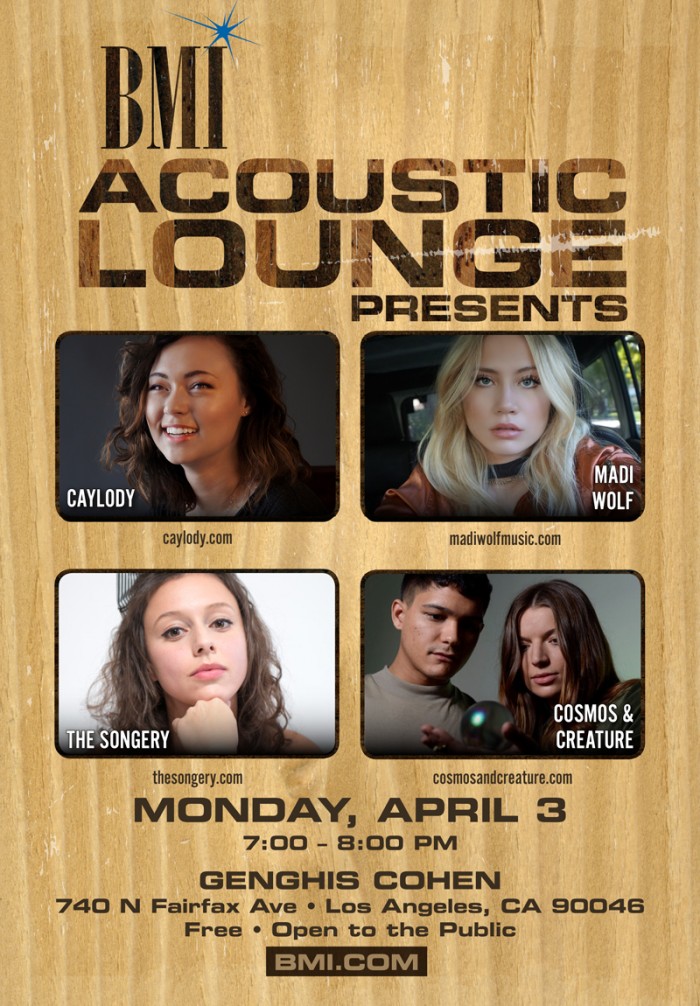 BMI Acoustic Lounge is held the first Monday of every month at Genghis Cohen (740 N. Fairfax Avenue, Los Angeles), 7:00-8:00 PM.