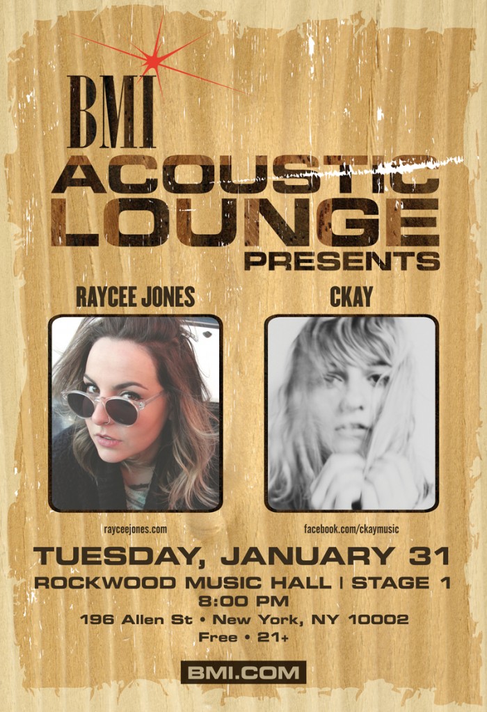 Singer/songwriter showcase series featuring acoustic performances in an intimate setting as well as networking opportunities with other songwriters and BMI representatives at Rockwood Music Hall, Stage 1 (196 Allen Street, NYC) at 8:00 PM.
