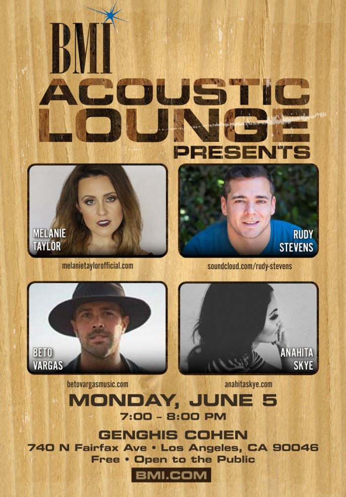 BMI Acoustic Lounge is held the first Monday of every month at Genghis Cohen (740 N. Fairfax Avenue, Los Angeles), 7:00-8:00 PM.