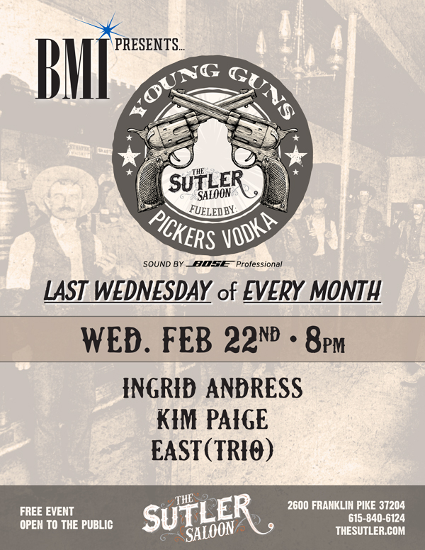 BMI Presents Young Guns @ The Sutler Saloon (2600 Franklin Pike, Nashville, TN) will take place the last Wednesday of every month, fueled by Pickers Vodka.