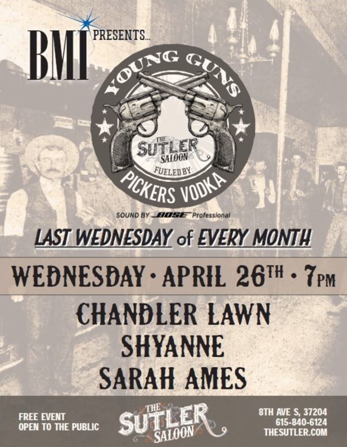 BMI Presents Young Guns @ The Sutler Saloon (2600 Franklin Pike, Nashville, TN) will take place the last Wednesday of every month, fueled by Pickers Vodka.