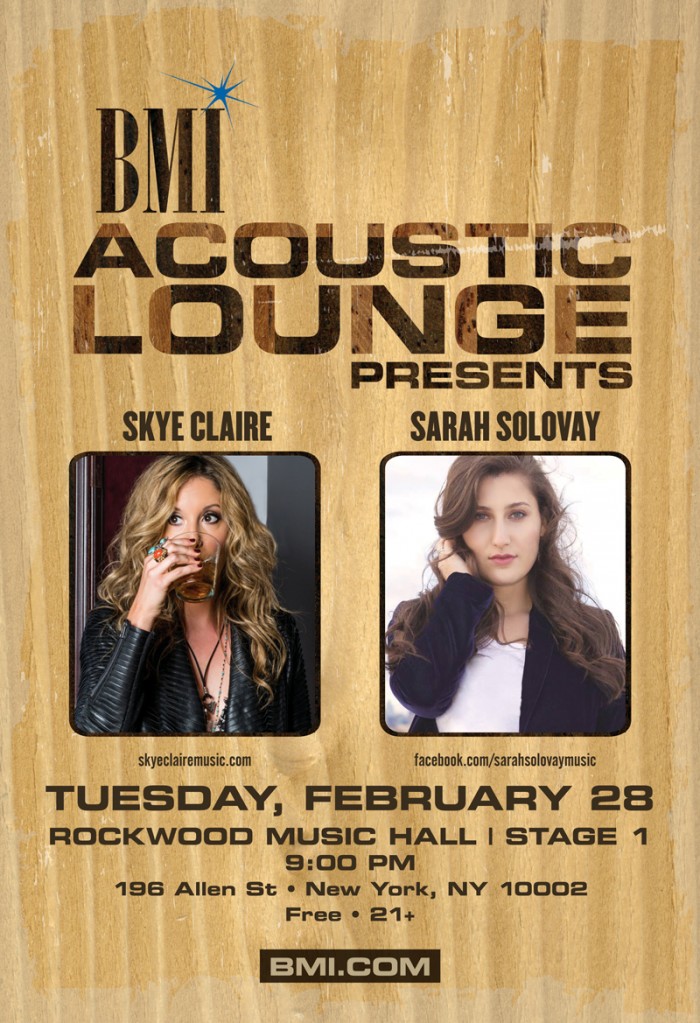 Singer/songwriter showcase series featuring acoustic performances in an intimate setting as well as networking opportunities with other songwriters and BMI representatives at Rockwood Music Hall, Stage 1 (196 Allen Street, NYC) at 9:00 PM.