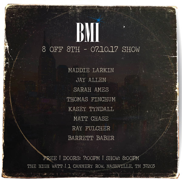 BMI & YEP (Young Entertainment Professionals) present “BMI 8 off 8th” at The High Watt (1 Cannery Row, Nashville, TN).
