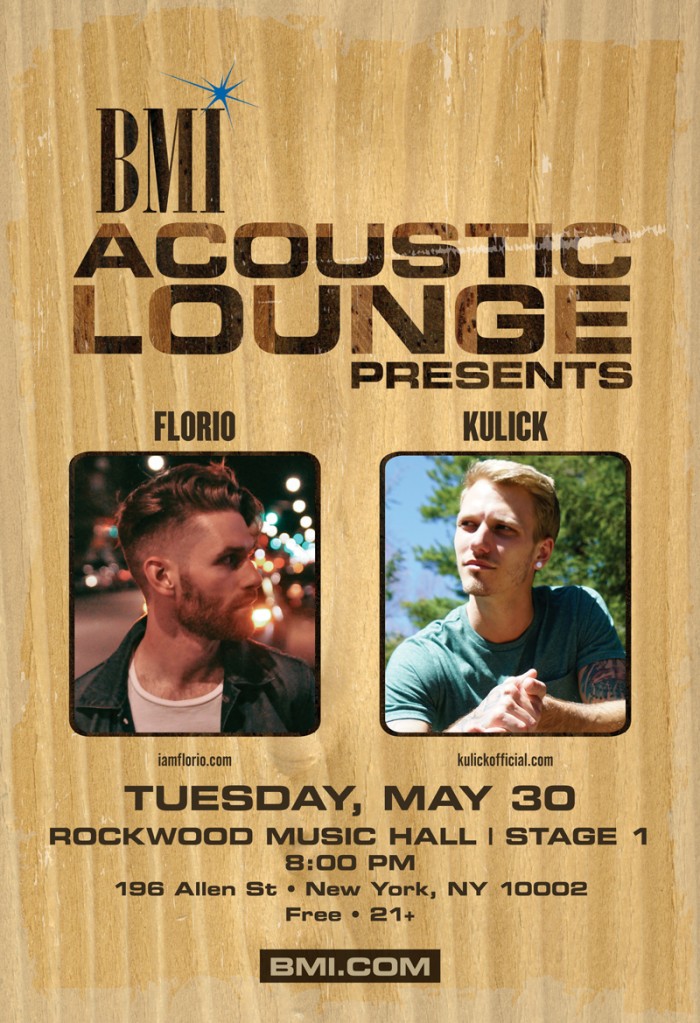 Singer/songwriter showcase series featuring acoustic performances in an intimate setting as well as networking opportunities with other songwriters and BMI representatives at Rockwood Music Hall, Stage 1 (196 Allen Street, NYC) at 8:00 PM.