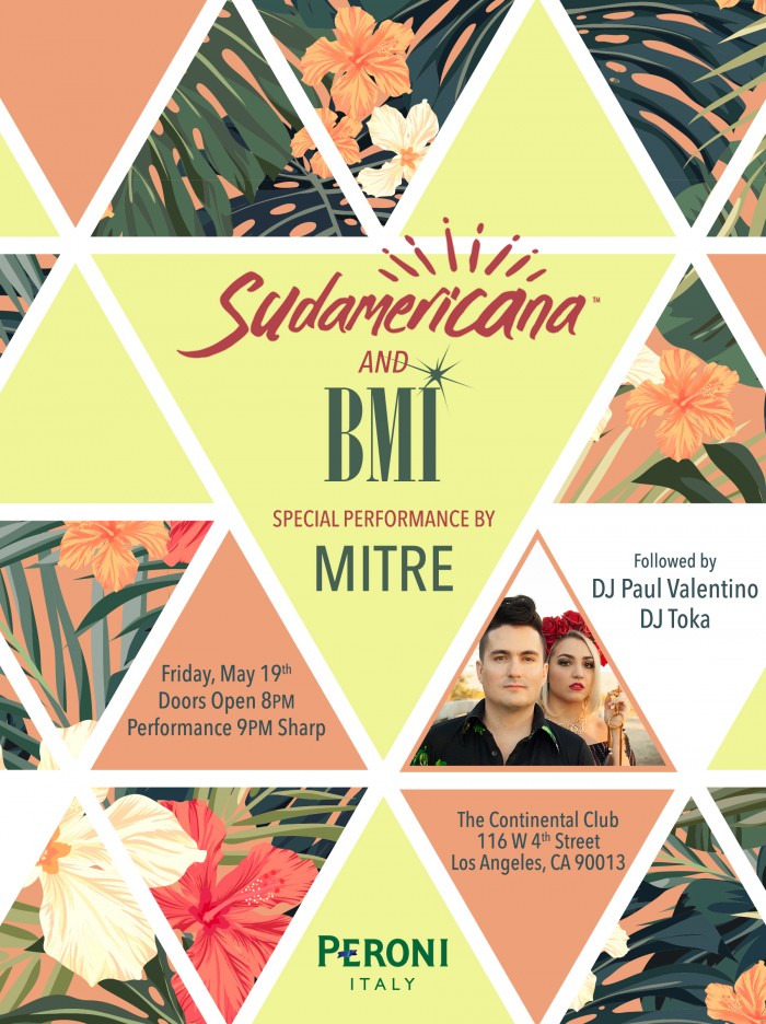 Sudamericana and BMI present a special performance by Mitre at The Continental Club (116 W. 4th Street, Los Angeles, CA). Doors open at 8:00 PM / Performance at 9:00 PM.
