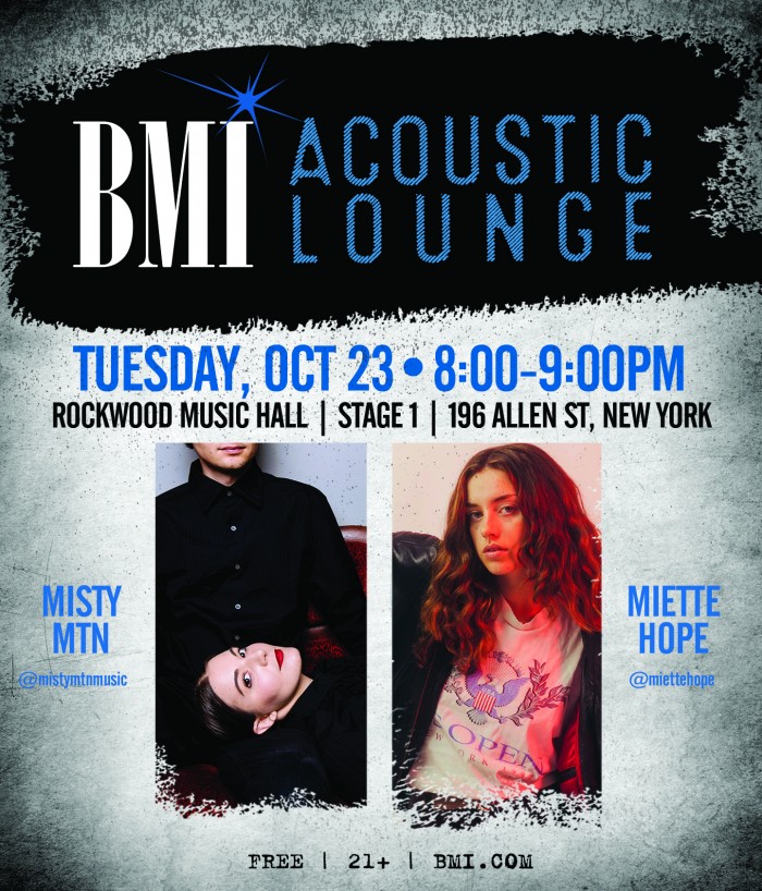 Singer/songwriter showcase series featuring acoustic performances in an intimate setting as well as networking opportunities with other songwriters and BMI representatives at Rockwood Music Hall, Stage 1 (196 Allen Street, NYC) at 8:00 PM.