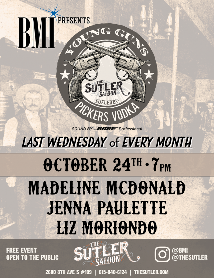 BMI Presents Young Guns @ The Sutler Saloon (2600 Franklin Pike, Nashville, TN) at 7:00 PM, and will take place the last Wednesday of every month, fueled by Pickers Vodka.