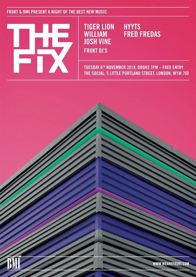 FRUKT and BMI, present…THE FIX, a live showcase of new music which takes place the first Tuesday of every month at The Social (5 Little Portland St, London, W1W 7JD). Doors open at 7PM. This event is FREE!
