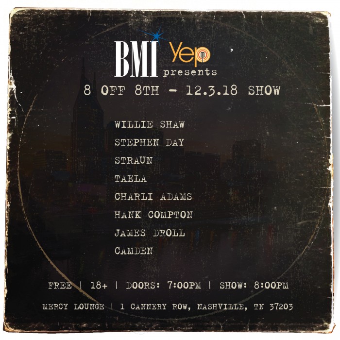 BMI & YEP (Young Entertainment Professionals) present “BMI 8 off 8th” at The High Watt (1 Cannery Row, Nashville, TN).