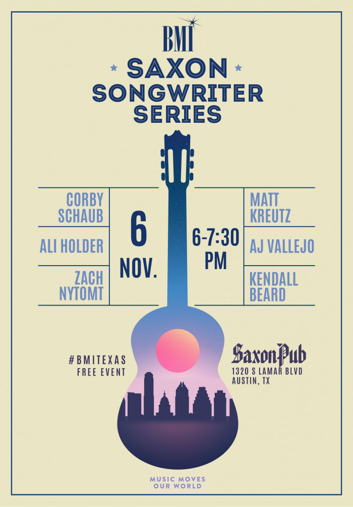 BMI Saxon Songwriter Series at Saxon Pub (1320 S. Lamar Blvd., Austin, TX), 6:00-7:30 PM.