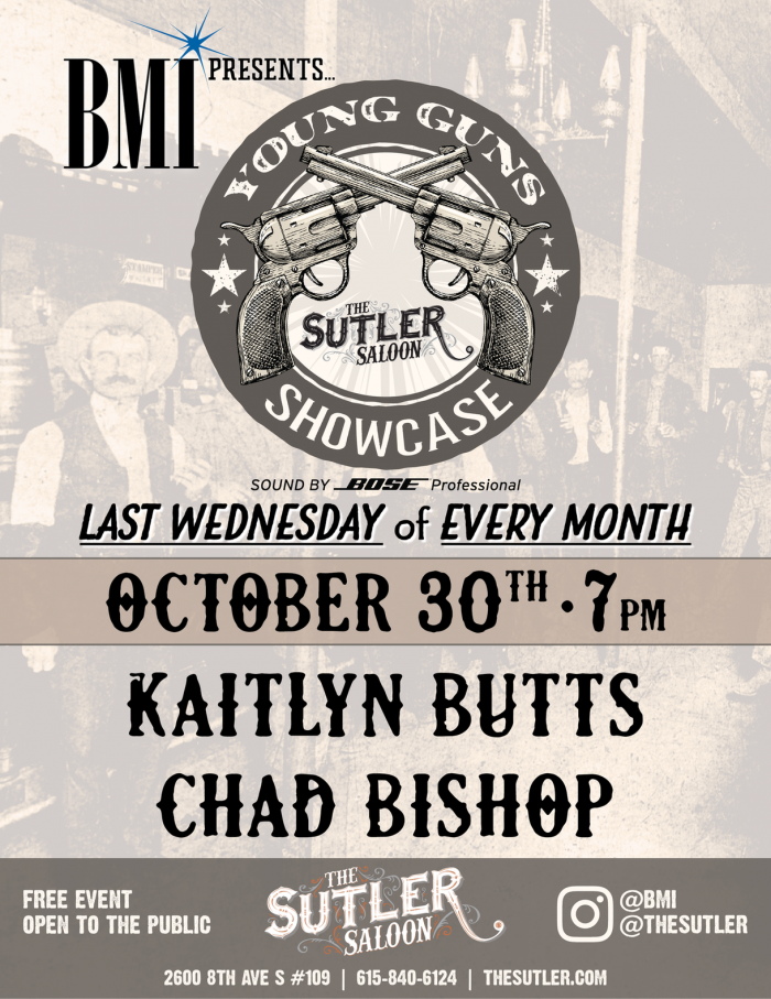 BMI Presents Young Guns @ The Sutler Saloon (2600 Franklin Pike, Nashville, TN) at 7:00 PM, and will take place the last Wednesday of every month, fueled by Pickers Vodka.