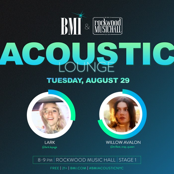 BMI Acoustic Lounge at Rockwood Music Hall, Stage 1 (196 Allen St. in the Lower East Side of Manhattan), 8:00-9:00 PM. Admission is FREE!.