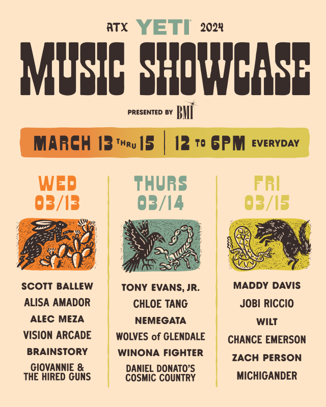 The Yeti Music Showcase Presented by BMI @ SXSW 2024, is taking place for three amazing days at the Yeti Flagship on South Congress (220 S Congress Ave), March 13th, 14th and 15th, 12:00-6:00 PM.