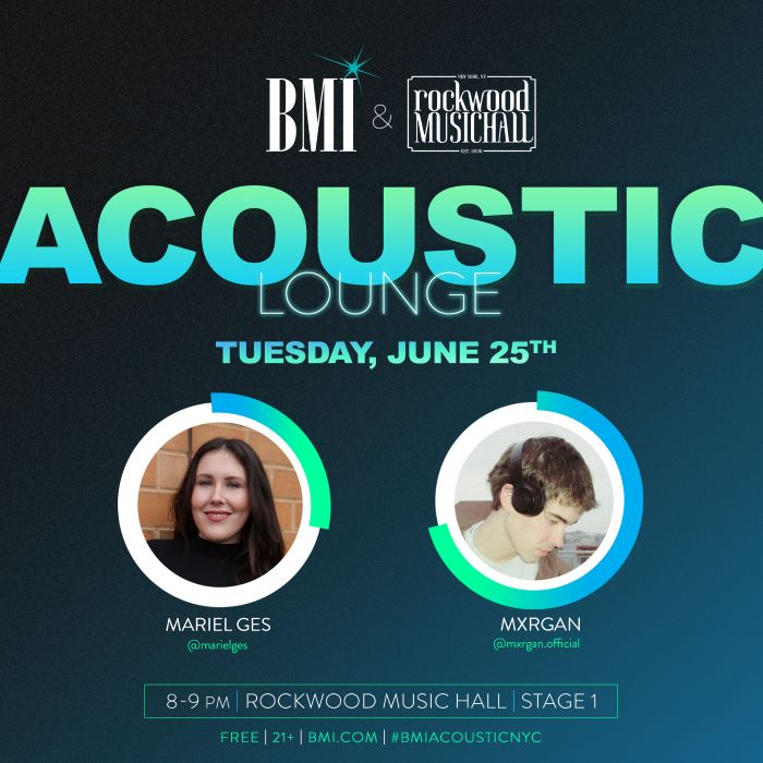 BMI Acoustic Lounge at Rockwood Music Hall, Stage 1 (196 Allen St. in the Lower East Side of Manhattan), 8:00-9:00 PM. Admission is FREE!