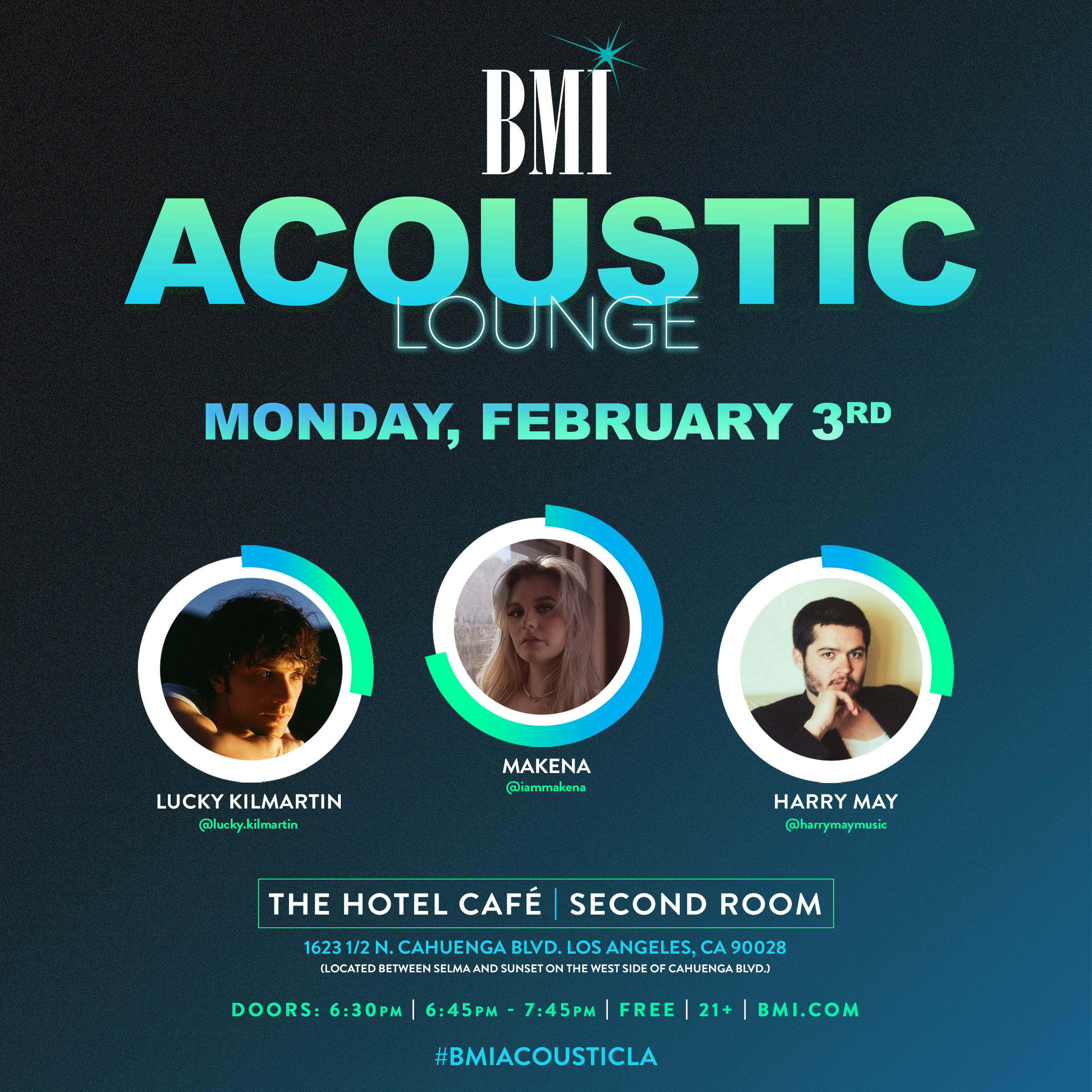 BMI Acoustic Lounge at The Hotel Café, Second Room (1623 1/2 N. Cahuenga Blvd., Los Angeles), 6:45-7:45 PM.
