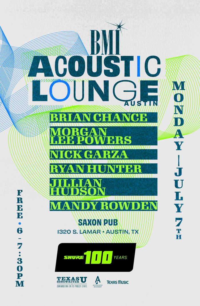 BMI Acoustic Lounge at Saxon Pub (1320 S. Lamar Blvd., Austin, TX), 6:00-7:30 PM. This monthly songwriter series takes place the first Monday of each month.
