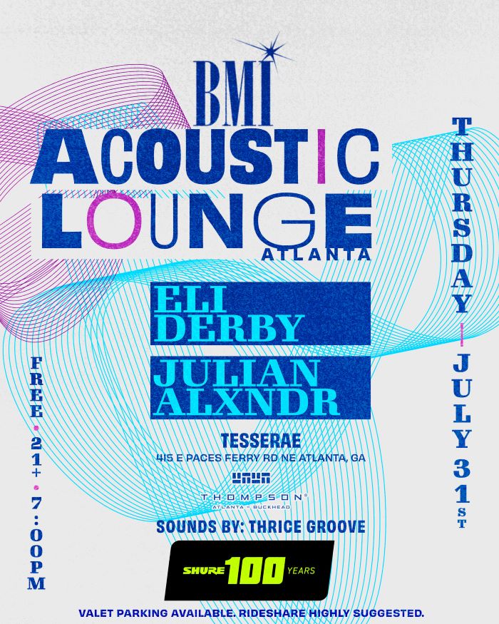 BMI Acoustic Lounge at Tesserae at Thompson Atlanta-Buckhead (415 E Paces Ferry Rd NE, Atlanta, GA), 7:00-10:00 PM. Admission is FREE!; 21+ Only.