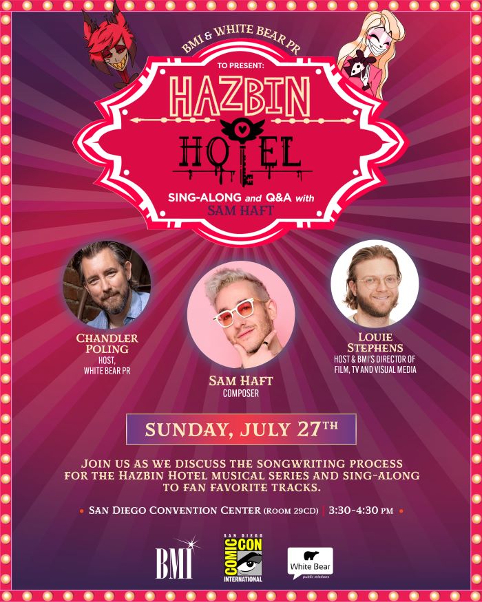 BMI and White Bear PR present…“Hazbin Hotel Sing-Along and Q&A with Sam Haft” at Comic-Con International 2025. The panel will be hosted by Louie Stephens, BMI’s Director of Film, TV & Visual Media, and Chandler Poling of White Bear PR, at the San Diego Convention Center, Room 29CD, 3:30-4:30PM.