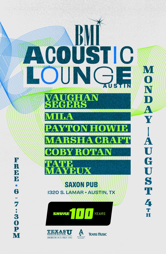 BMI Acoustic Lounge at Saxon Pub (1320 S. Lamar Blvd., Austin, TX), 6:00-7:30 PM. This monthly songwriter series takes place the first Monday of each month.