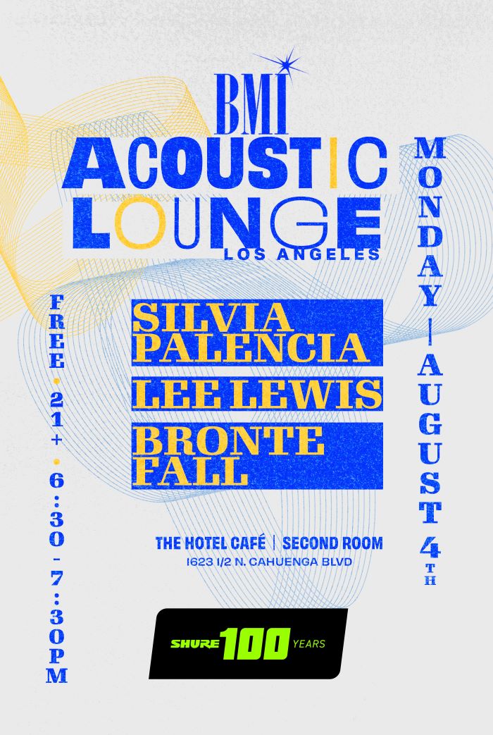 BMI Acoustic Lounge at The Hotel Café, Second Room (1623 1/2 N. Cahuenga Blvd., Los Angeles), 6:30-7:30 PM. Admission is FREE!; 21+ Only.