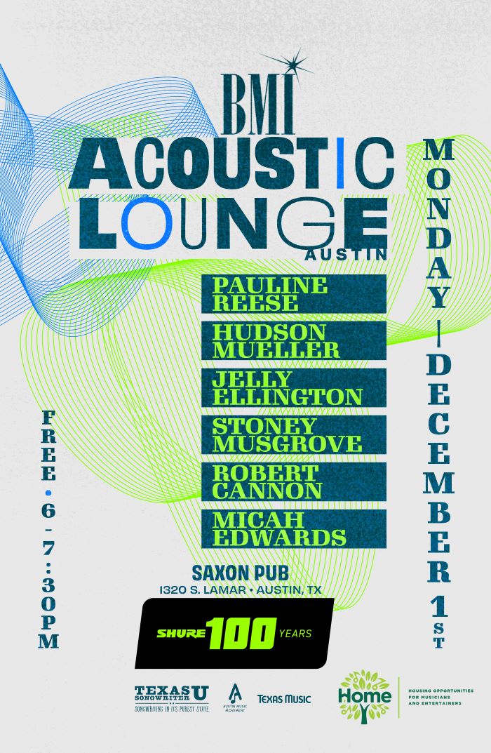 BMI Acoustic Lounge at Saxon Pub (1320 S. Lamar Blvd., Austin, TX), 6:00-7:30 PM. This monthly songwriter series takes place the first Monday of each month. Admission is FREE!