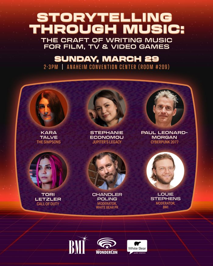 BMI & White Bear PR present “Storytelling Through Music - The Craft of Writing Music for Film, TV, and Video Games” panel at WonderCon 2026, 2:00-3:00PM, at the Anaheim Convention Center, Room: 209 (800 W Katella Ave., Anaheim, CA 92802)
