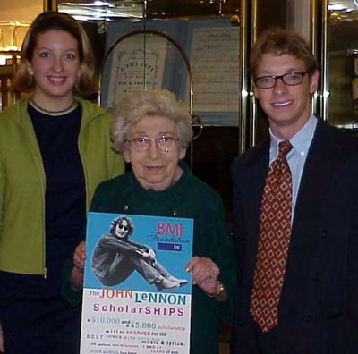 The BMI Foundation held a luncheon today in honor of the winners of the 2nd Annual John Lennon Scholarship. Established by Yoko Ono in conjunction with the Foundation and Gibson Musical Instruments, the first and second place winners were awarded $10,000 and $5,000, respectively, for Best Song with Original Music and Lyrics. Seen here before the luncheon are (l-r): Berklee College of Music senior Anne Chandler who received the Grand Prize of $10,000 for her song "Just For Tonight"; BMI Foundation President Thea Zavin; and University of Arizona Outreach Choir student David Ragland, the second place winner for his piece "I Don't Have the Blues."