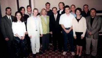 ![]() Songwriter Showcase committee members congratulated those honored writers after the performance at Nashville�s Renaissance Hotel: (l to r) BMG Music�s Joe Shell, Word-Idea�s Cindy Wilt, songwriter Brent Bourgeois, BMI�s Mark Mason, songwriter and showcase host Steven Curtis Chapman, BMI�s Joyce Rice, songwriter Bob Herdman of Audio Adrenaline, songwriters Gerald Crabb, Robert White Johnson and Joe Beck, Poor Richard�s Richard Headen, Brentwood-Benson�s Holly Zabka, EMI-CMP�s Rick Cua, and Centergy�s Niles Borop. |