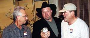 ![]() Chad Brock shows off his engraved BMI cup to the song�s producers, Buddy Cannon (l) and Norro Wilson |