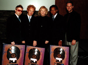 BMI's Joyce Rice (center) congratulates dc Talk's Kevin Max, Toby McKeehan and Michael Tait and Forefront Records's Greg Ham. For more information on dc Talk, visit http://www.dctalk.com/ and http://www.forefrontrecords.com/ncom/ff/index.html