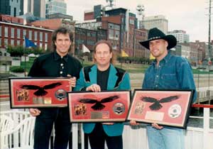 ![]() Henry Paul, Van Stephenson and Dave Robbins with gold plaques for their Arista album BlackHawk (1994). photo by Alan Mayor |