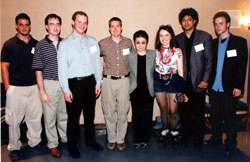 | Winners of the 4th annual John Lennon Scholarship are congratulated by scholarship benefactor Yoko Ono after the presentation. Shown from left are Honorable Mention winners Frank Dillon and Thomas P. Conlon, 2nd place winners (tie) Ben Ward and Michael Flynn, Ono, 1st place winner Margarita Shamrakov, 3rd place winner Mark Tewarson and Honorable Mention winner Daniel Romer-Friedman. |