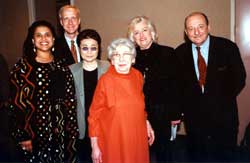 | Seen here enjoying the cocktail reception are (l-r): Suzan Jenkins, RIAA Senior Vice President of Marketing, who served as a judge and presenter; Henry Juszkiewicz, Gibson Guitars President and CEO; Lennon Scholarship benefactor Yoko Ono; Theodora Zavin, BMI Foundation President; Frances Preston, BMI President and CEO; and legendary record producer Arif Mardin, who also served as a judge and presenter. |