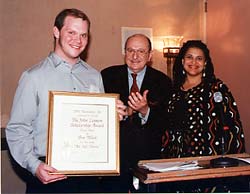 | 2nd place winner, Ben Ward, receives a plaque and some applause from judges Arif Mardin and Suzan Jenkins |