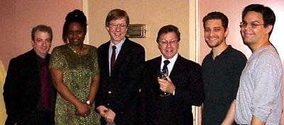 ![]() Sharing a toast at the reception are (l-r): David Spencer, who won a Kleban Award in 2000; Kirsten Childs, a 1999 Kleban recipient; Cook; BMI composer and Kleban Foundation president Maury Yeston; and 2000 Kleban winners Jeff Marx and Bobby Lopez. |