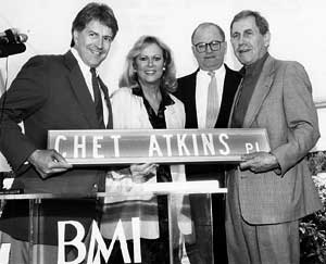 ![]() Atkins (right) is seen here in 1991 at the BMI-hosted dedication party of "Chet Atkins Place" on Music Row, only the second person (Roy Acuff was the first) to be honored with a namesake street. Presenting him with the framed street sign are BMI's Harry Warner and Joyce Rice, and former BMI VP Roger Sovine. |