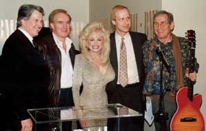 ![]() At a 1993 ceremony unveiling a new Chet Atkins model from Gibson Guitars: BMI's Harry Warner, Ralph Emery, Dolly Parton, Gibson's Henry Juskiewicz and Chet Atkins. photo: Alan Mayor |