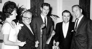 ![]() At the 1961 BMI Country Awards: BMI's Frances Preston and Robert J. Burton, Harlan Howard, Joe Allison and Buck Owens |