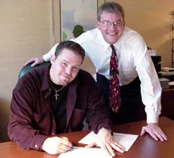 ![]() James Otto and BMI's Perry Howard | Mercury Nashville recording artist James Otto recently stopped by BMI to affilate with the performing rights organization. Upon moving to Nashville in 1998, Otto began playing writer's nights in Nashville and eventually met his producer, Scott Parker. The duo cut six songs in sessions that, according to Otto, "seemed like magic." The result was impressive enough to earn him his record deal. Otto's debut album is due late summer 2002. |