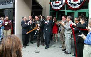 ![]() IBMM Board Chairman Steven Brechter (with scissors) and Gov. Paul Patton (at mic) declare the museum open |