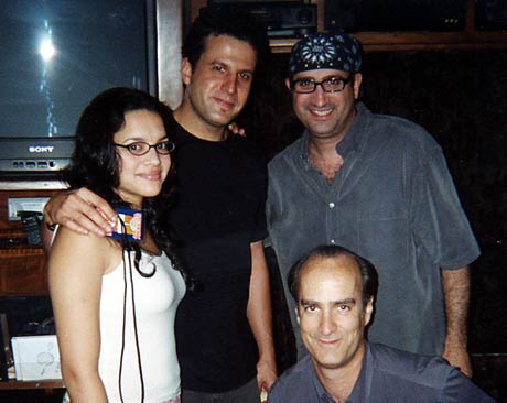 BMI singer/songwriter Norah Jones (left) stops for a photo after her recent performance at the Tweeter Center in Camden, NJ where she opened for the Dave Matthews band. Seen here with Jones on her tour bus are fellow BMI songwriters Lee Alexander (Jones' bass player) and Jeff Cohen, and BMI's J.W. Johnson (kneeling).