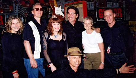 Shown at the Guitar Center's Rock Walk induction for southern California rock group X are BMI's Tracie Verlinde; X's Billy Zoom, Exene Cervenka and John Doe; BMI's Barbara Cane and Myles Lewis; kneeling is X's DJ Bonebrake.