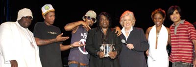 Producer/songwriters Rodney Jerkins, Pharrell Williams, and Dallas Austin, who produced and performed the musical tribute to BMI ICON Award winner James Brown, Brown, BMI's Frances Preston and Catherine Brewton, and producer Chad Hugo