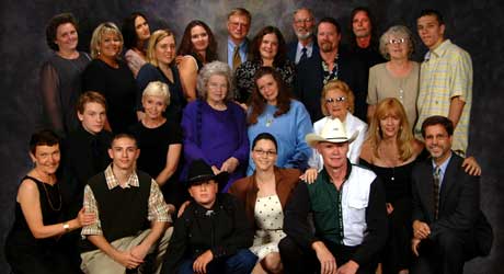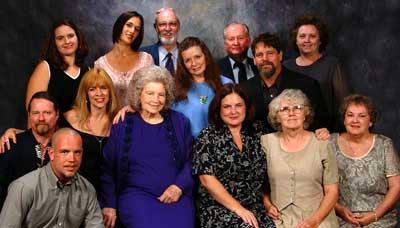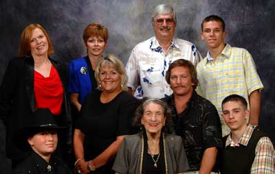 ![]() [upper row] Maybelle's great-granddaughters Kimberly Fuston and Tiffany Lowe, Don Jett, June Carter Cash, Maybelle's son-in-law Glenn Jones [husband of Helen Carter], Maybelle's grandson Kevin Jones, Rita Forrester; [lower row] Maybelle's grandson Danny Jones, Carlene Carter, Janette Carter, Lorrie Bennett, Flo Wolfe, Phyllis Jett [Don's wife];[kneeling] Jason Fuston [husband of Kimberly]. photos by Richard Mink |